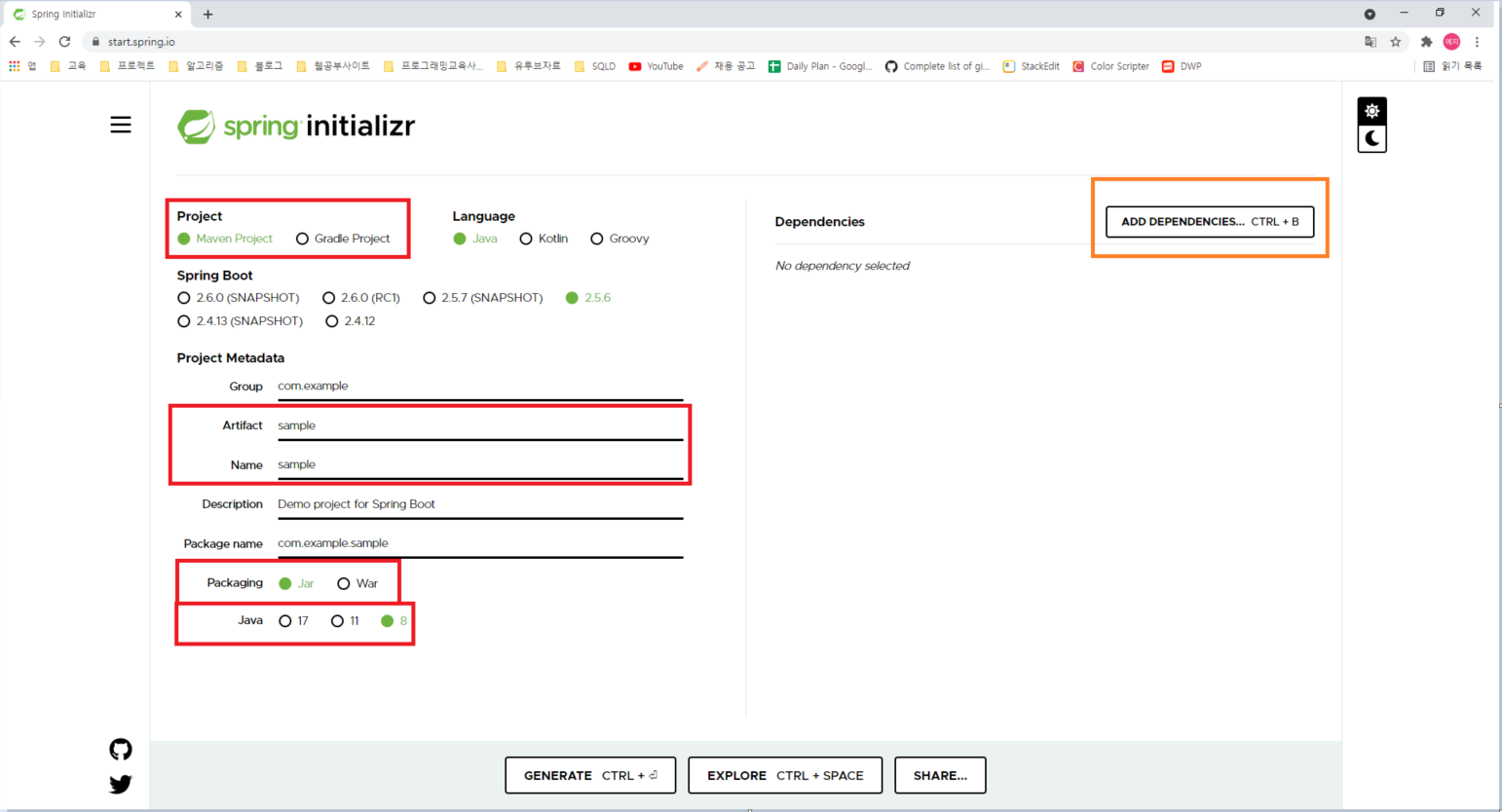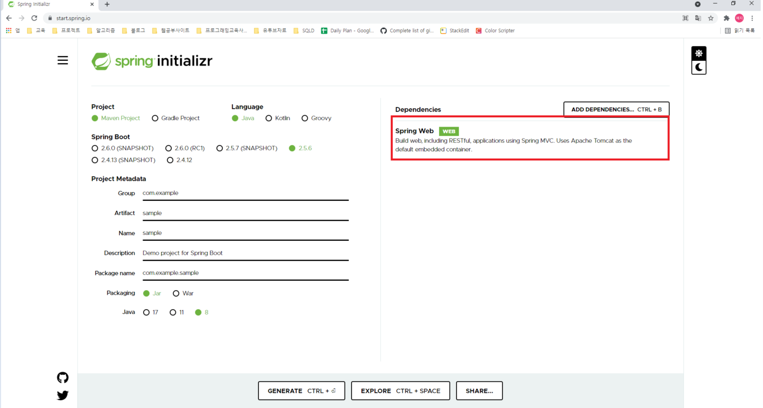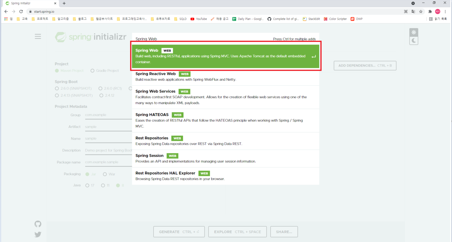 > 우측 상단의 ADD DEPENDENCIES 클릭하여 Spring Web 의존성 추가