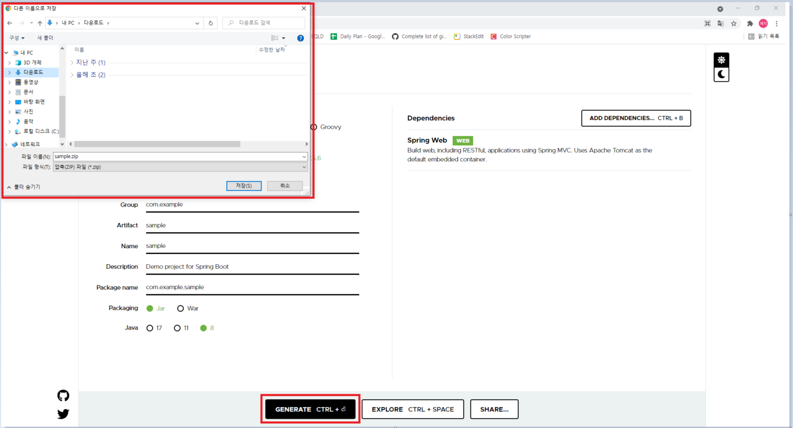 > GENERATE를 클릭하여 프로젝트를 생성하고, 다운로드 폴더에 저장한다.
