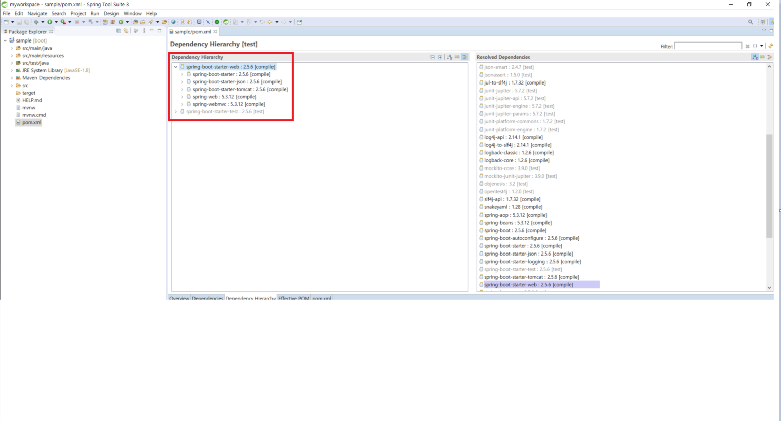 Dependency Hierarchy를 통해 starter 패키지가 포함하는 수많은 jar 파일들을 확인할 수 있다.