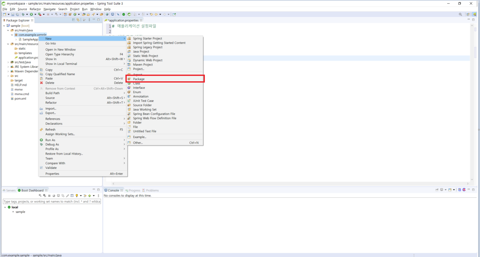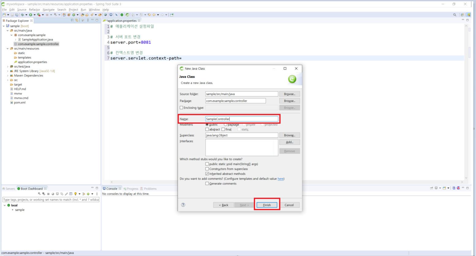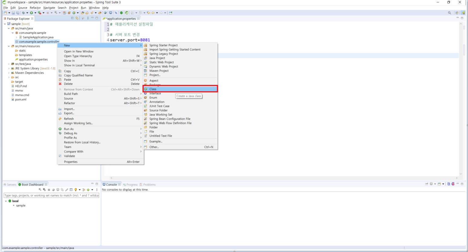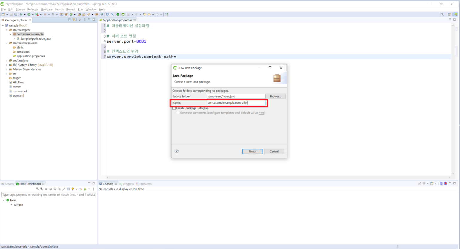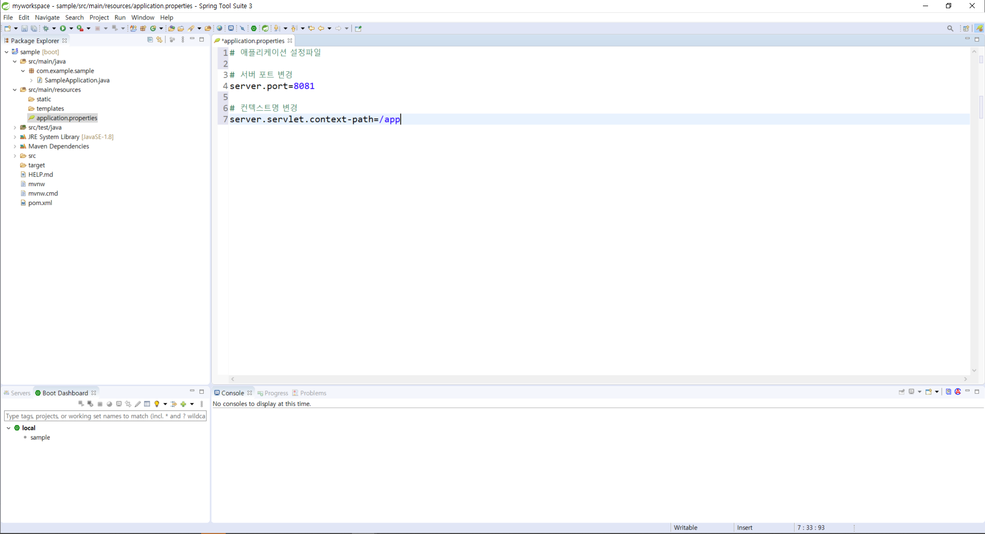 프로젝트 설정파일인 application.properties에 서버 포트 번호 및 컨텍스트 path를 등록