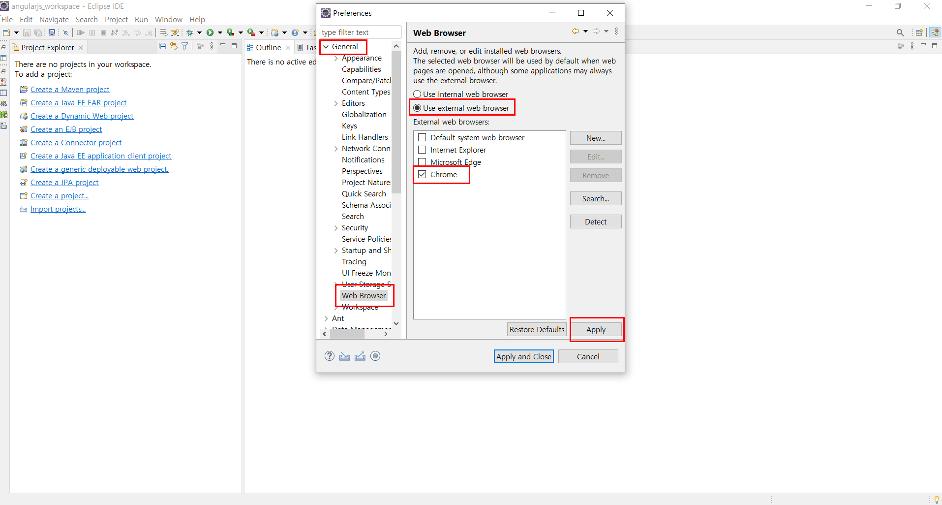 General -> Web Browser -> Use external Web browser 체크 -> Chrome 체크 -> Apply 3. 서버 설정 (아파치 톰캣9.0)
