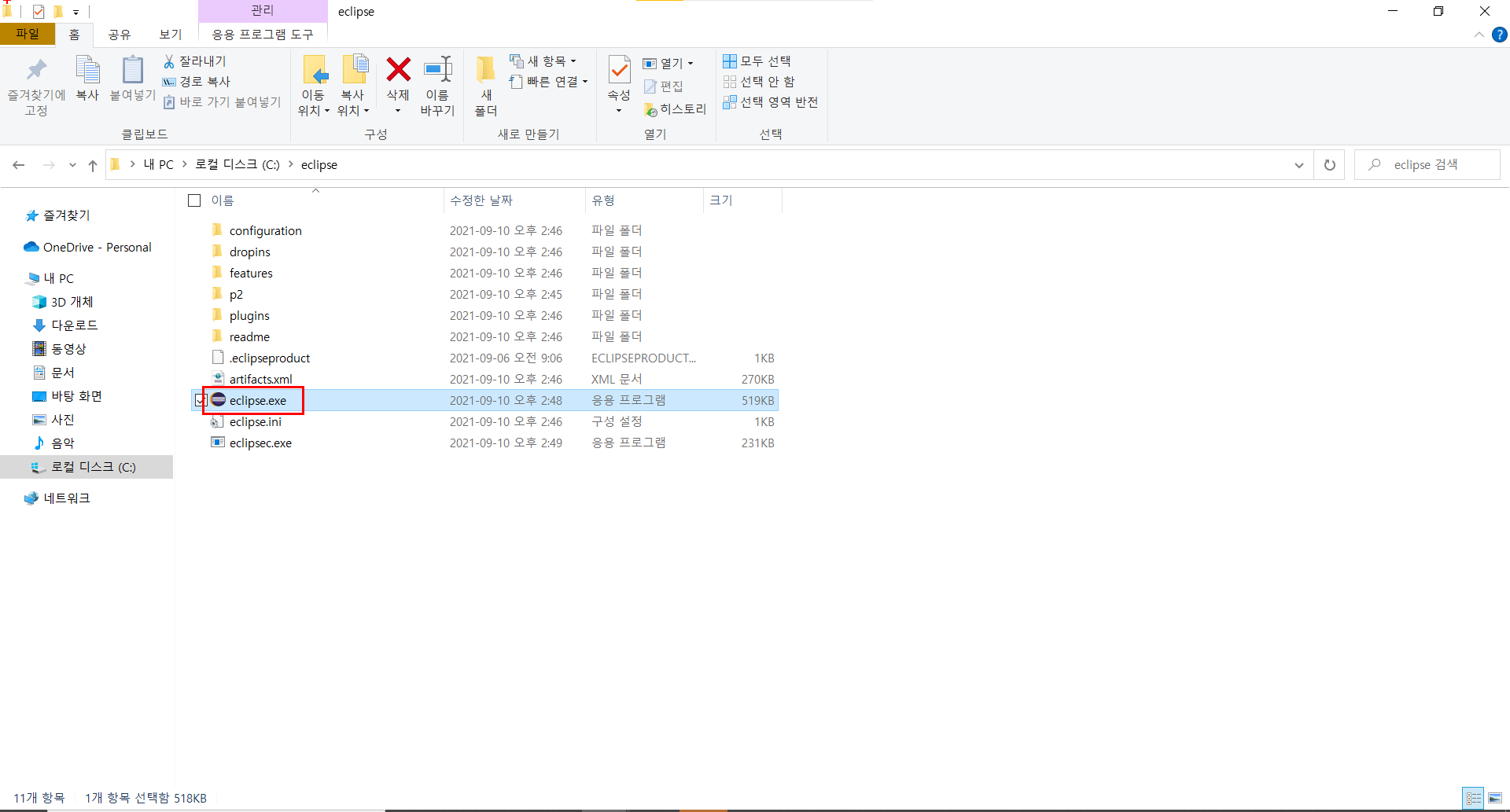 > eclipse 폴더로 들어가 eclipse 실행파일인 eclipse.exe를 실행한다