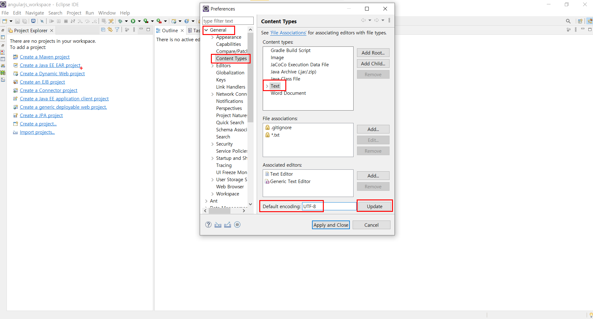General -> Content Types -> Text -> UTF-8 입력 -> Update 클릭 -> Apply and Close 클릭 > 기본 브라우저 크롬으로 설정