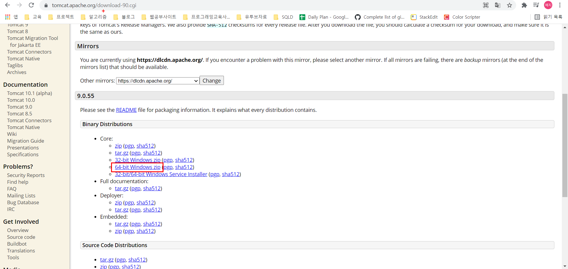 > 자신의 컴퓨터 사양에 맞는 톰캣 파일을 다운 받는다