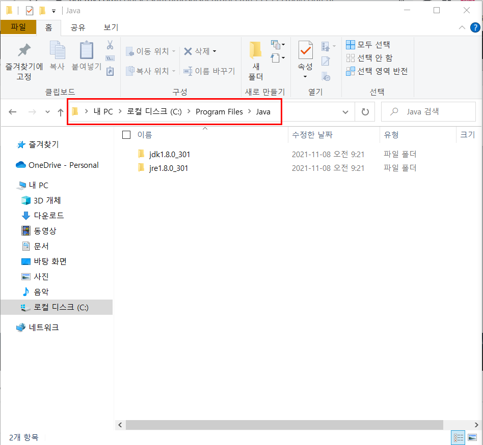 > C://Program Files//Java 경로로 들어가면 JDK가 정상적으로 설치된 것을 볼 수 있다.