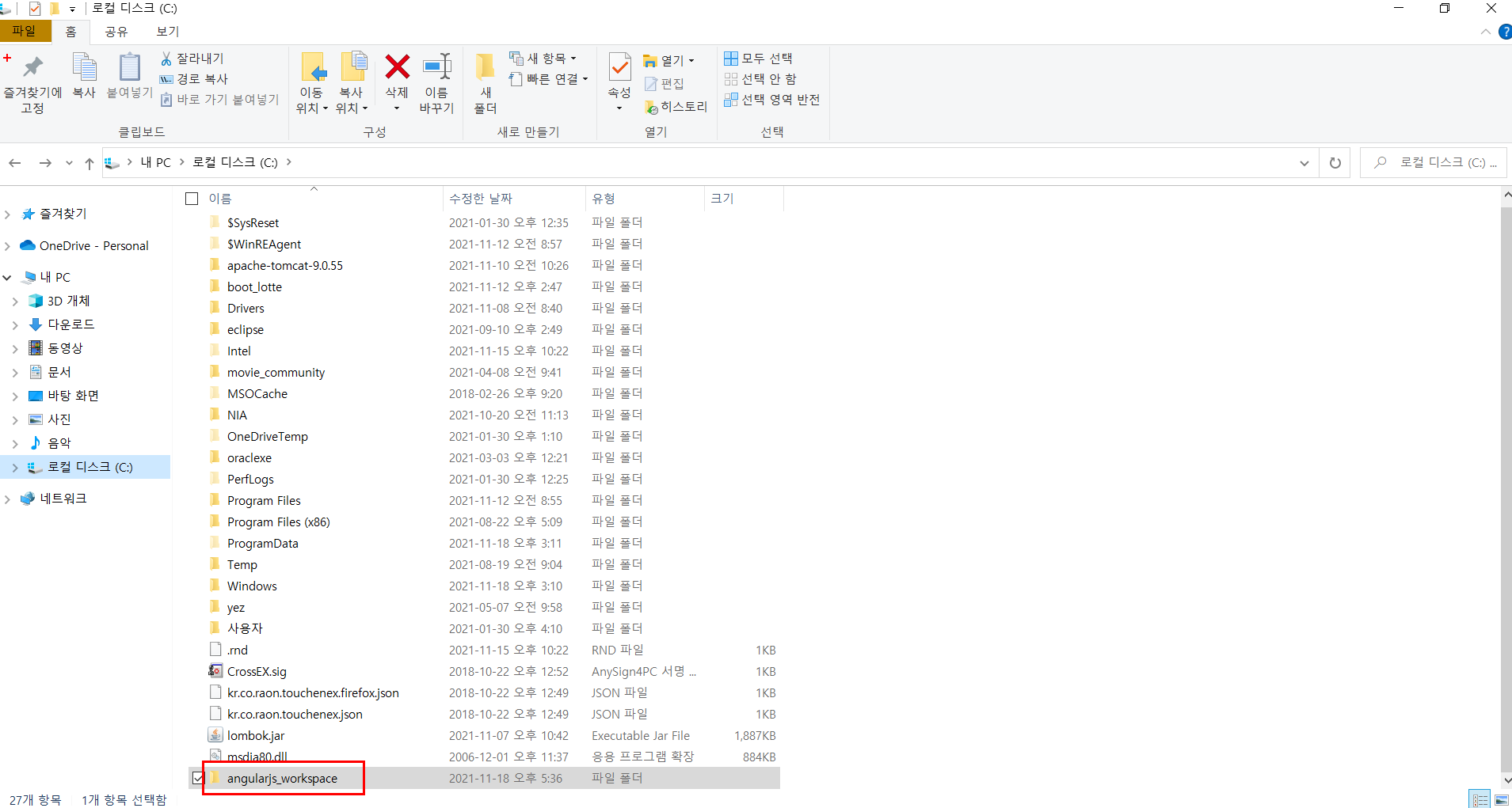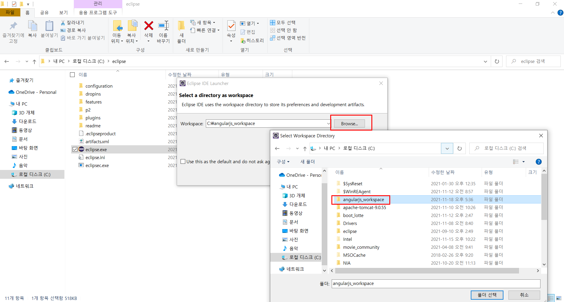> 이클립스의 workspace로 쓸 새폴더를 생성하고 angularjs_workspace로 이름을 변경한다
