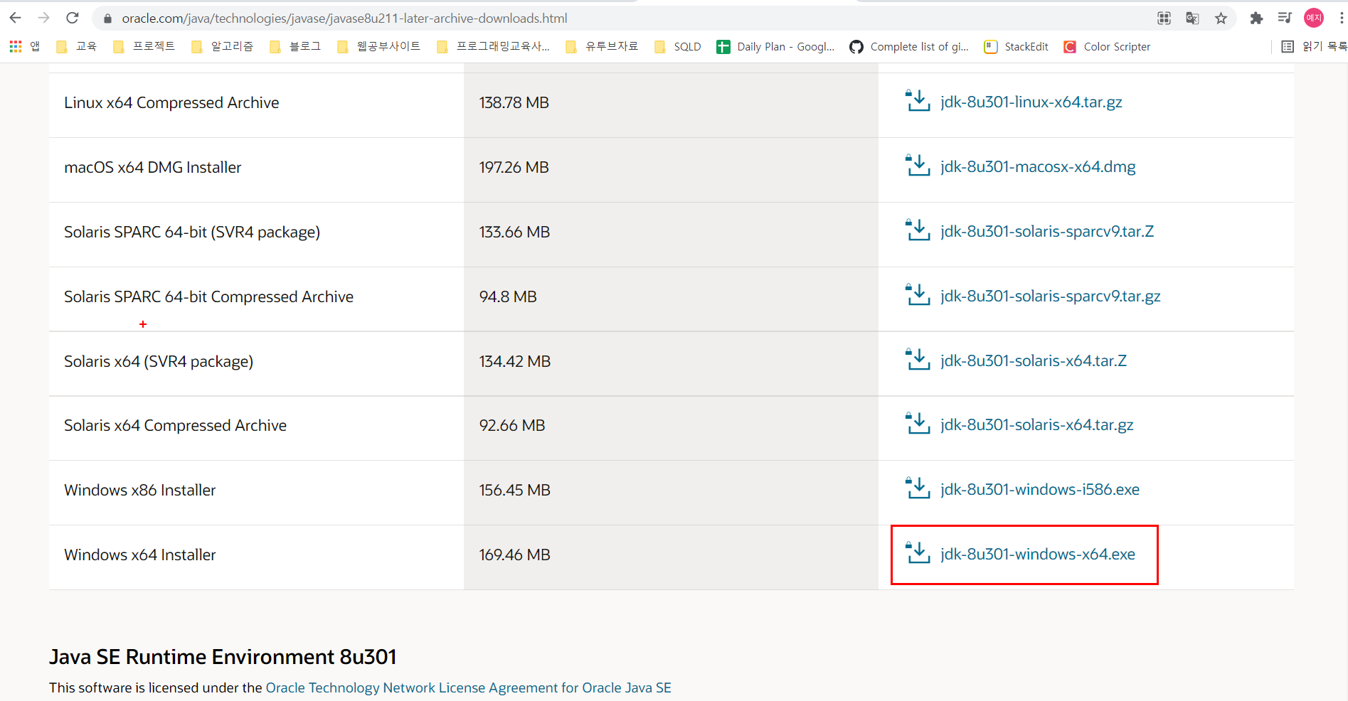 > 자신의 컴퓨터 사양에 맞는 jdk 설치파일을 다운로드 받는다.