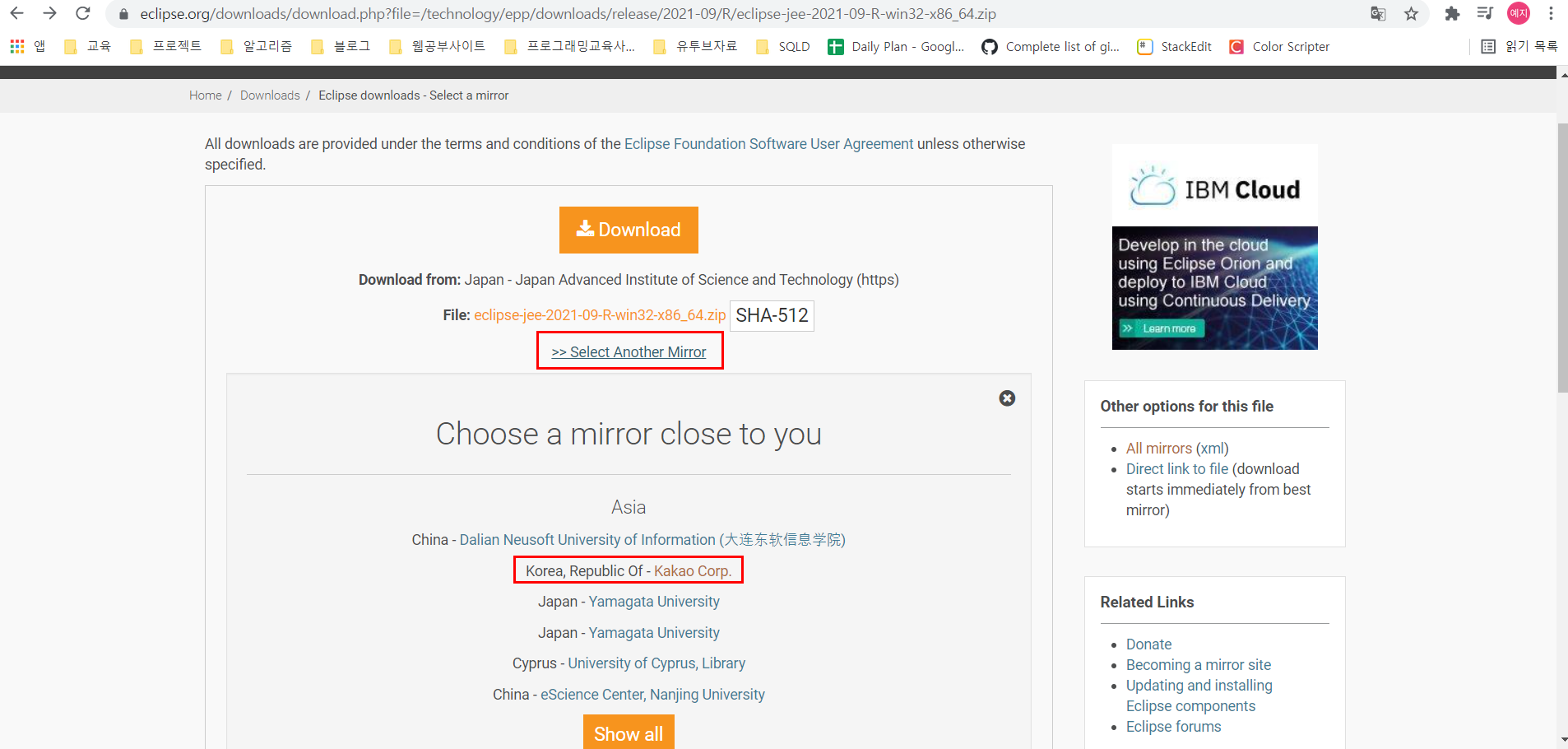 > Select Another Mirror를 클릭해 미러서버를 한국으로 설정한 뒤 다운로드한다