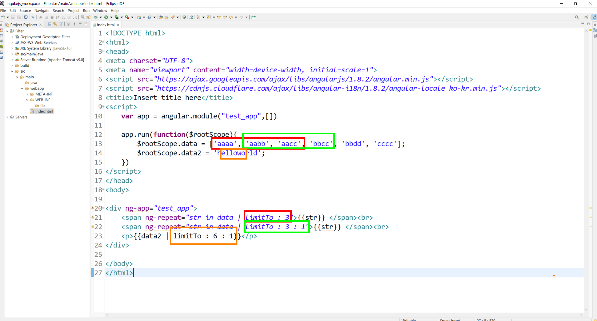 > data | limitTo : 출력할 개수[ : 시작 index] : 배열 혹은 문자열의 사용갯수 및 시작 인덱스 제어
