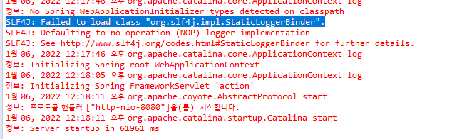 콘솔 로그를 살펴보니 slf4j 클래스를 정상적으로 로드하지 못하고 있었다.