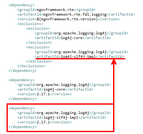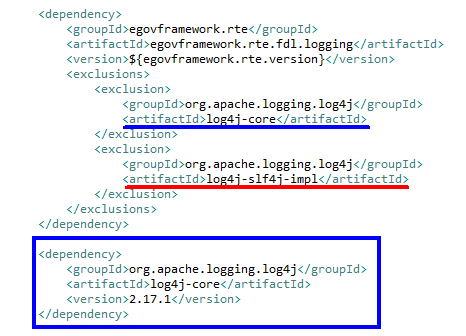 egovframework.rte.fdl.logging 의존성 패키지에서 log4j-core와 log4j-slf4j-impl가 제외(exclusions)되어 있는 형태였는데,