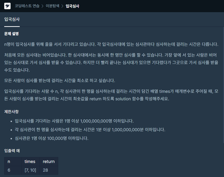 심사를 기다리는 사람 수를 n, 각각의 심사관이 1명을 심사하는 데 걸리는 시간이 담긴 배열 times가 주어졋을 때