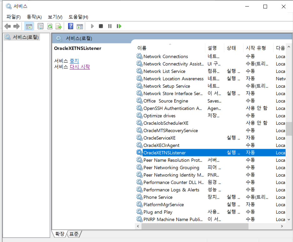 - OracleServiceXE 실행 중인거 확인, OracleXETNSListener 중지했다가 다시시작해보자.